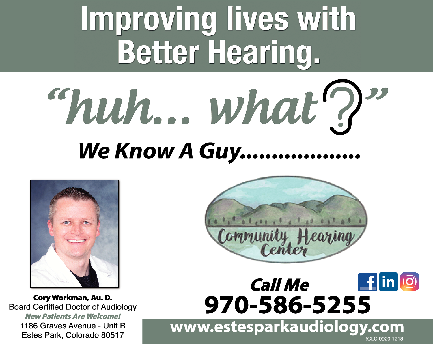 Community Hearing Center was established to care for the residents of the Estes Valley, by providing the best care possible that is close to home. Dr. Cory Workman continues to provide top notch care in a caring and compassionate environment. Whether you have hearing loss, tinnitus, or care for someone who does, we are ready to help. Why go to the valley when there is care close to home? Dr. Workman and Community Hearing Center stand ready to serve you.