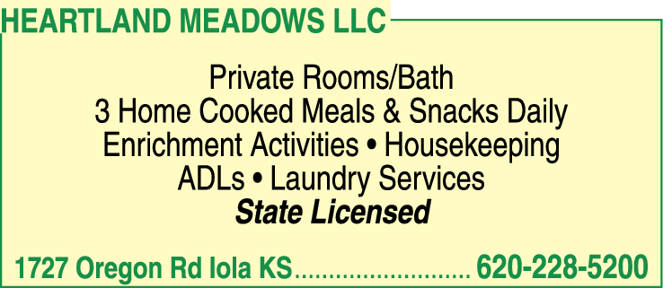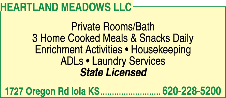 At Heartland Meadows LLC, we prioritize the safety and well-being of our residents. Our state license speaks to our commitment to meeting and surpassing health and safety regulations. With our friendly and professional staff, individuals and their families can have peace of mind knowing they are in good hands. To learn more or schedule a visit, please contact us at 620-228-5200.