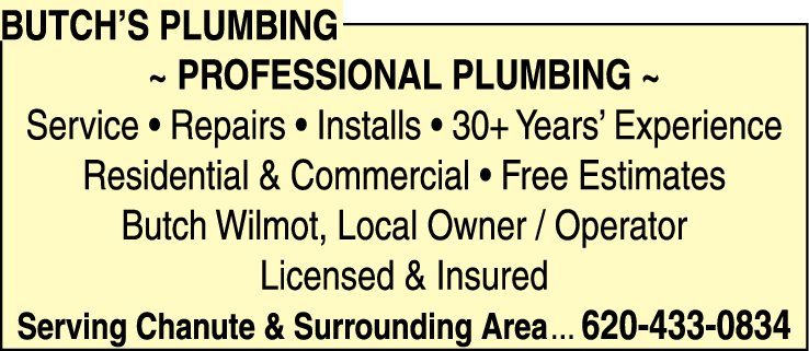Butch's Plumbing is a trusted and reliable plumbing service with over 30 years of experience in the industry. We offer a wide range of services including repairs, installations, and maintenance for both residential and commercial properties. As a local owner/operator, Butch Wilmot takes pride in delivering exceptional customer service and ensuring the highest quality workmanship. Our team is fully licensed and insured, providing peace of mind to our valued customers. We offer free estimates for all our services, allowing our clients to make informed decisions about their plumbing needs. Serving Chanute and the surrounding areas, Butch's Plumbing is committed to providing professional and reliable plumbing services. Give us a call at 620-433-0834 to experience our exceptional service firsthand.