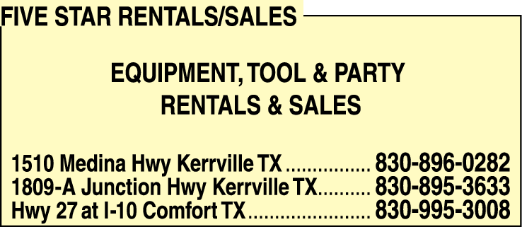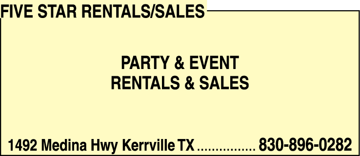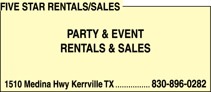 Five Star Rentals/Sales is a premier party and event rentals and sales business located in Kerrville. With a commitment to exceptional customer service and high-quality products, we cater to individuals and organizations looking to host unforgettable events. Our extensive inventory includes a wide range of party supplies, furniture, decorations, and equipment, available for both rental and purchase.