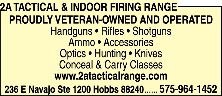 2A Tactical is a proudly veteran-owned and operated business in Hobbs, NM. We offer a wide variety of handguns, rifles, shotguns, ammo, magazines, optics, hunting, knives, and accessories. Ask us how to sign up for our conceal and carry classes. And, come visit us at our new Indoor Firing Range in Hobbs.