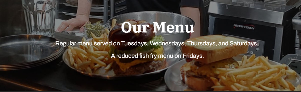 Burgers , Home Fried Kettle Chips , French fries , 9 Piece Shrimp Basket , Grilled chicken , Build-your-own pizzas , Sandwiches , 5 Piece Chicken Tender Basket , Spinach Artichoke Wonton , Friday fish and chips , Walleye Fingers , Onion Petals , 5 Tempura Shrimp , Bavarian Pretzel , Calamari Sticks , Brussel Sprouts , Crispy Chicken , Steak Bites , Broasted Chicken Wings , 4 Piece Chicken Dinner , Deep Fried Portobella Strips , Cheese curds , Appetizers , Fried Cod , Deep Fried Mozzarella Sticks , Grilled Cheese