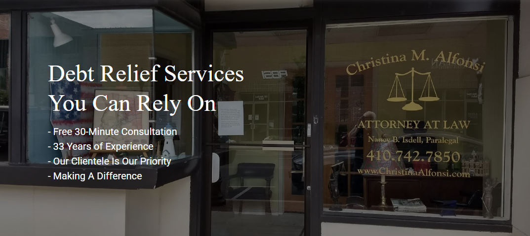 For years, Alfonsi Christina M Bankruptcy has been a trusted partner for individuals in need of debt relief in Salisbury and the surrounding areas. Our commitment to professionalism, integrity, and client satisfaction sets us apart from the rest. If you are facing overwhelming debt and considering bankruptcy as a solution, we invite you to reach out to our expert team at 410-742-7850. Take the first step towards a brighter financial future by contacting Alfonsi Christina M Bankruptcy today.
