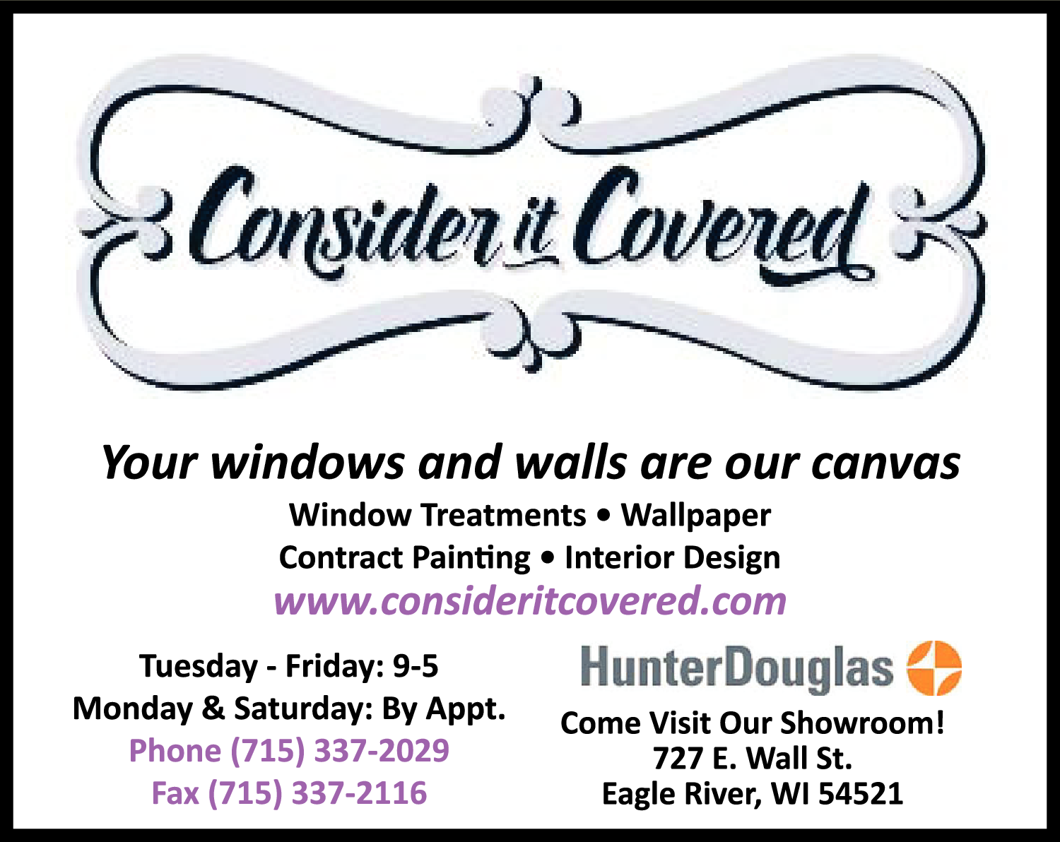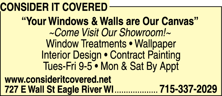With more than 20 years experience servicing customers in the retail and contract painting and decorating business as The Paint Bucket, Inc., owners Jeff and Connie Maines have recently sold the retail paint portion of their business and have reopened as Consider It Covered, located at 727 E Wall St. in Eagle River.