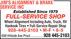 Jim's Alignment & Brake Service stands as a longstanding fixture in Prescott, AZ, with deep roots in the local community for over four decades. As a trusted Full Service shop, their expertise shines in alignments, steering/suspension, and brake repairs. But their offerings extend beyond the essentials, encompassing a range of vehicle services from fluid maintenance to intricate engine work like timing belts and water pump replacements.