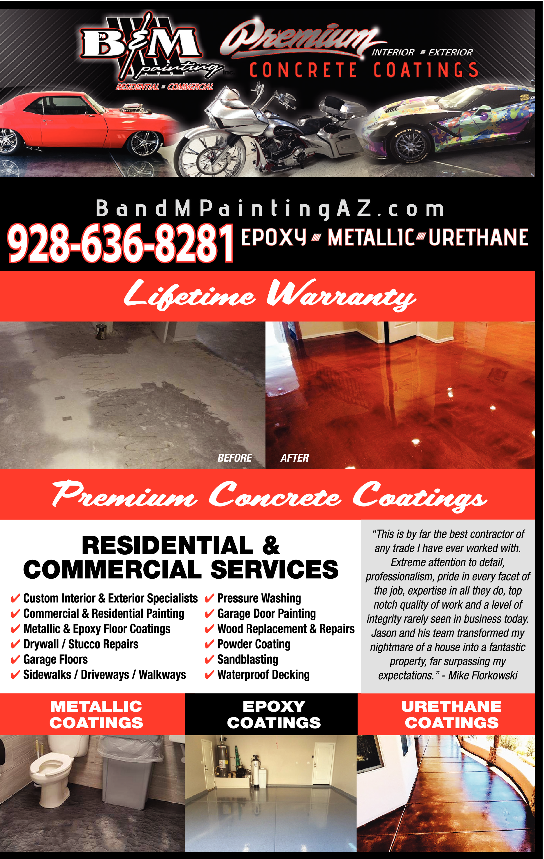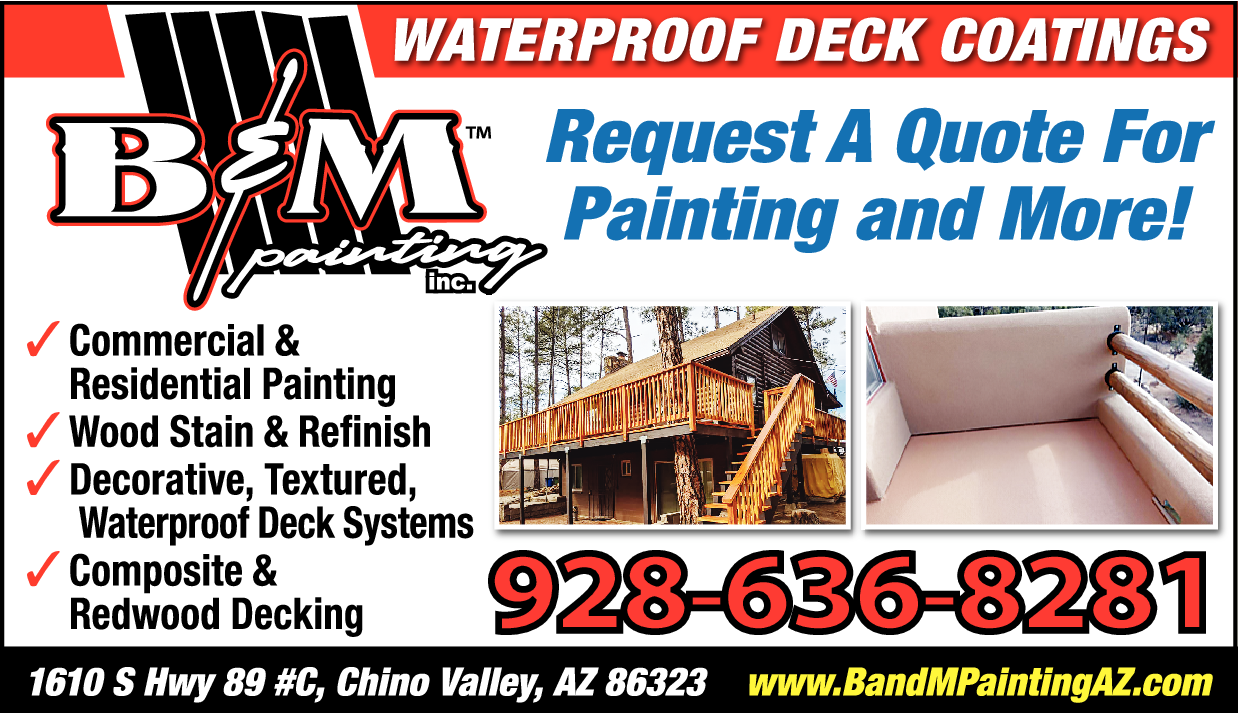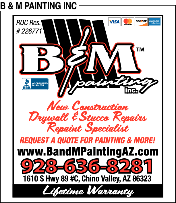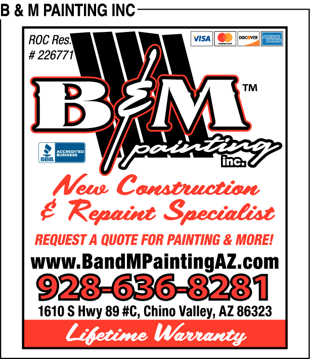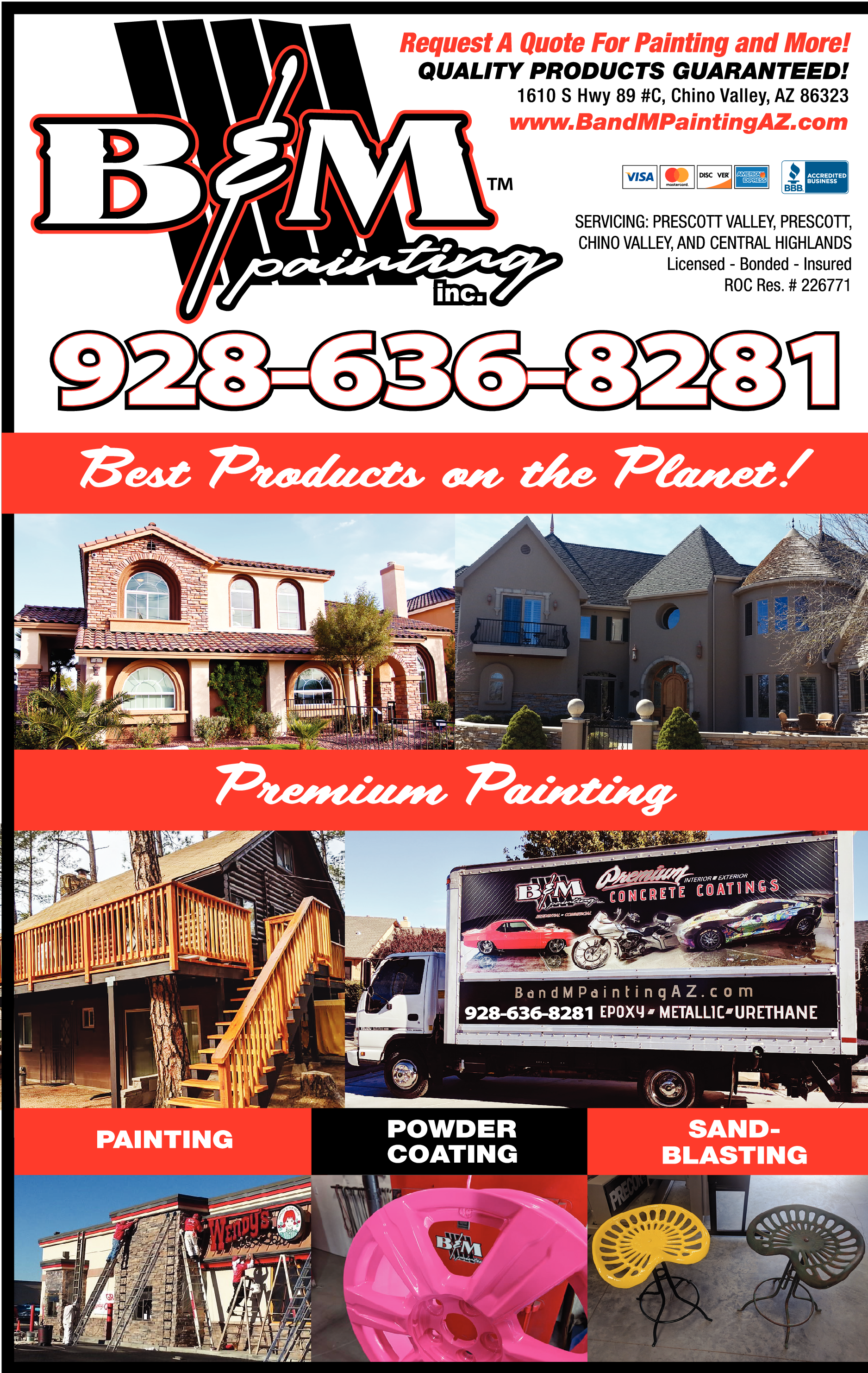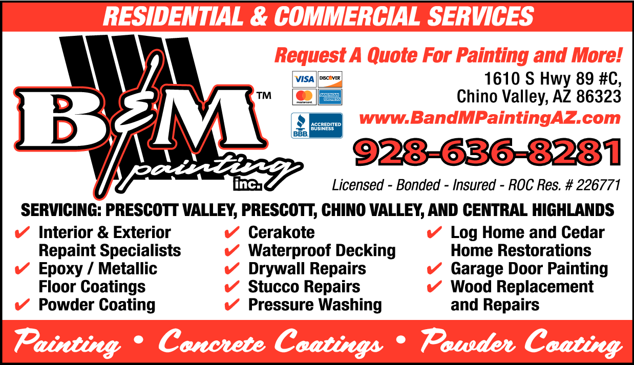 Interior, Exterior House Painter, House Painting Specialists, and a Residential And Commercial Painting Contractor. Experience the difference. the B&M Painting Inc. Difference. House painting specialists in Prescott Arizona. Whether the work entails painting or repainting one room or transforming your entire property, you are making an investment. B&M Painting, Inc. only uses high quality paints and coating products and has trained experts for each project which guarantees superior long lasting results for our clients. Preparing each surface is done with precision and care. It is the most important stage of any project. Every surface on your project will receive two coats of paint / coating to ensure quality and longevity.