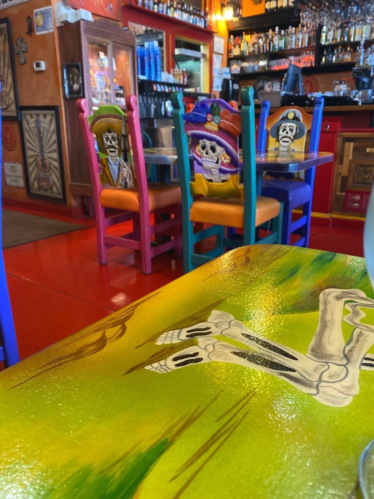 Suspended above the dining room is a hand forged agave chandelier, lined by a row of hand-blown glass lanterns hung along a set of old fashioned pull out windows. Mexican folk art, Milagro crosses and decorative silver tin ceiling panels surround this festive, locally owned, family friendly, and rustic style restaurant.