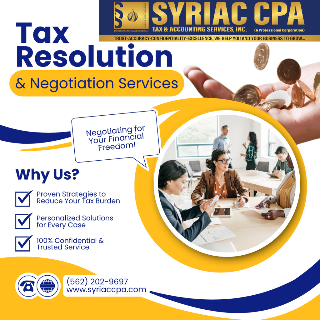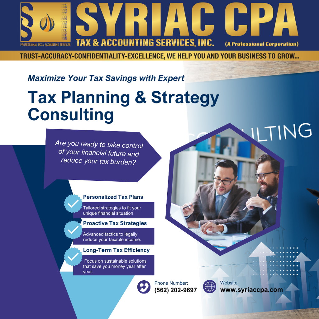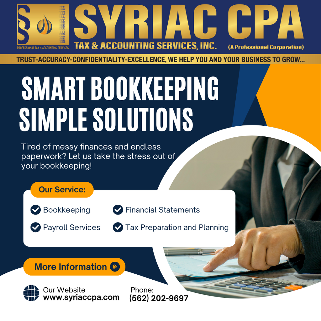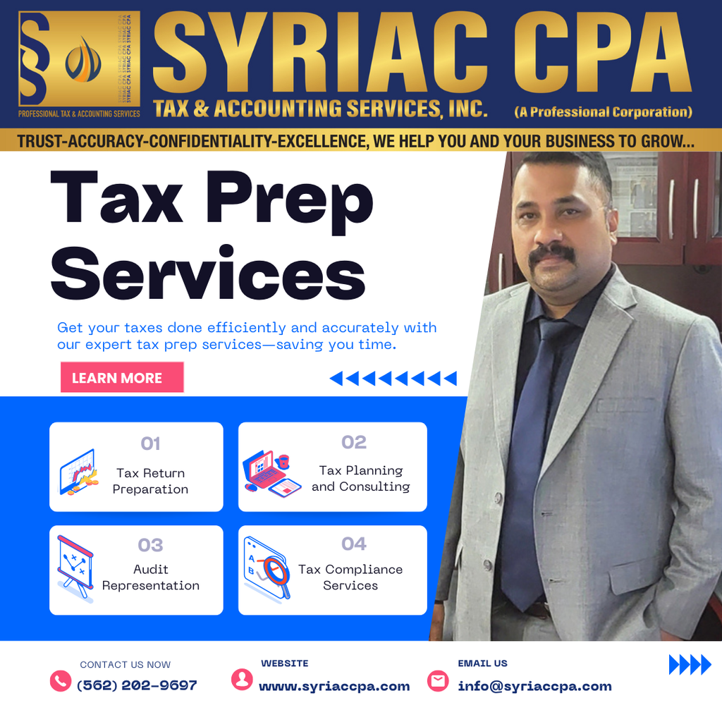 Syriac CPA Tax and Accounting Services Inc. is a trusted CPA firm based in California, providing comprehensive tax preparation, accounting, bookkeeping, payroll, and business consulting services. We specialize in personalized financial solutions for individuals, small businesses, and corporations — with a strong focus on accuracy, compliance, and maximizing savings. Our expert team is committed to helping clients navigate complex tax laws and make informed financial decisions with confidence.