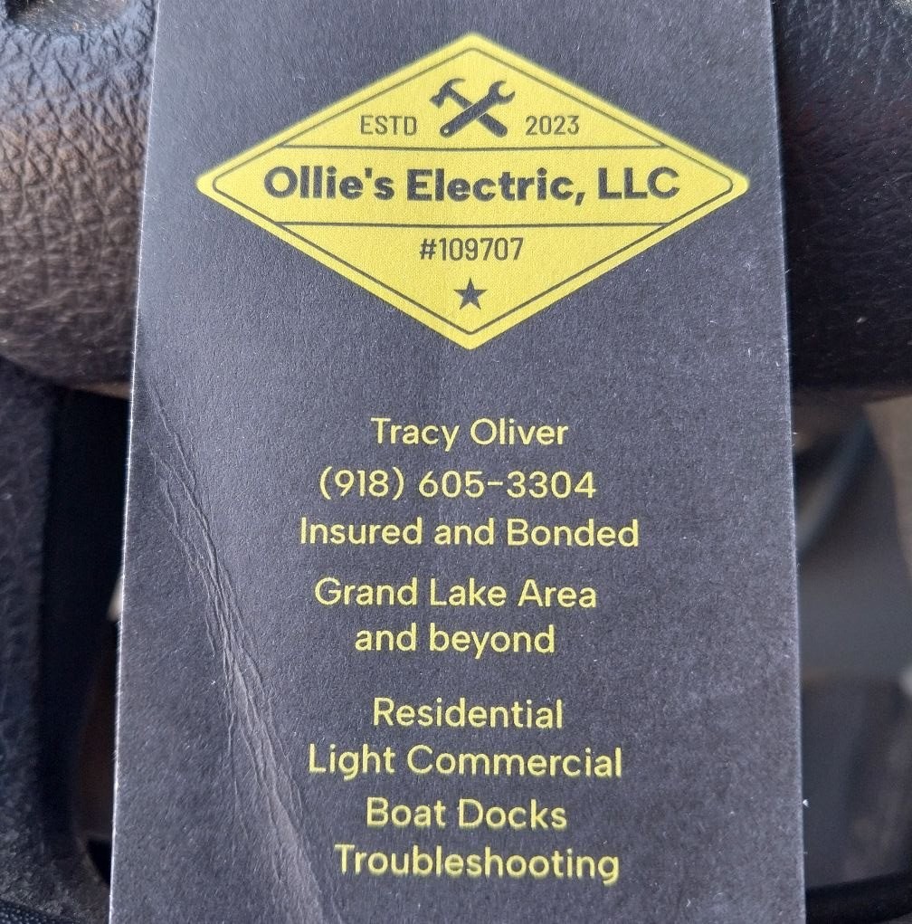 Ollie's Electric, LLC, is a Veteran owned & locally operated company, Since 2023. With over 19 year's experience, owner Tracy Oliver, proudly services the Grand Lake & Northeastern Oklahoma area.