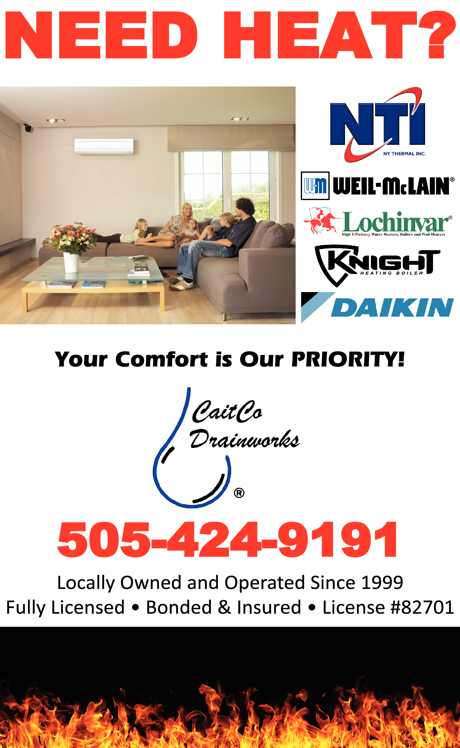 CaitCo Drainworks has been northern New Mexico’s number one business and residential HVAC, plumbing, and sewer and water line experts for over 20 years. We will always treat you like family, and we pride ourselves on doing the job correctly the first time.