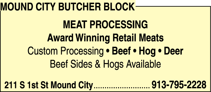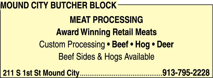 Mound City Butcher Block Meat Processing is a renowned retail meat provider and custom processing facility that has been serving the community with award-winning products for years. Located at 211 S 1st St in Mound City, our skilled butchers offer a wide range of high-quality meats to cater to diverse customer needs.