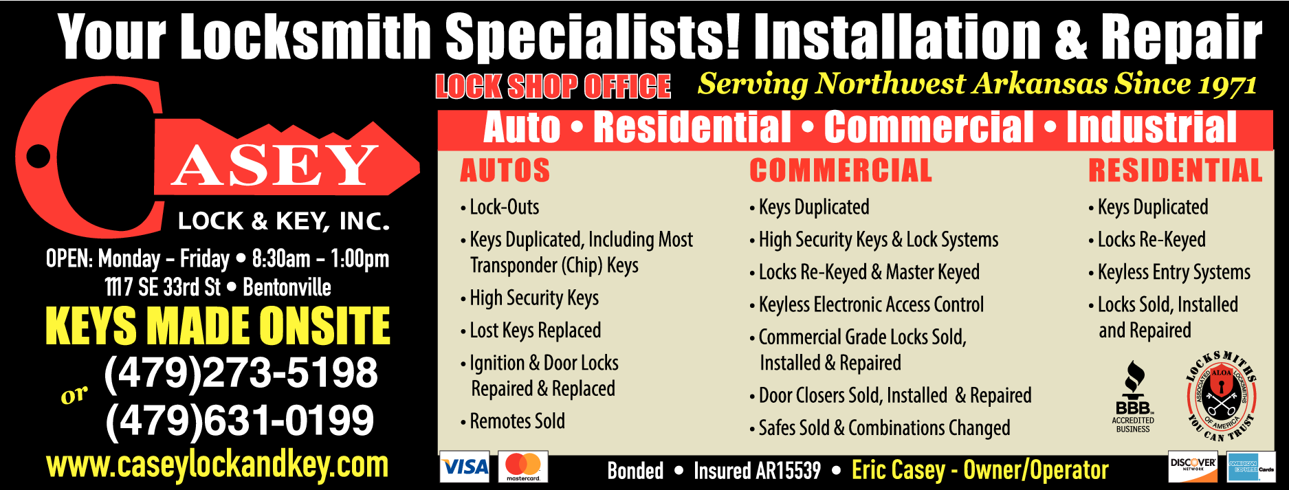 Casey Lock & Key is a trusted, family-owned locksmith company serving Northwest Arkansas since 1971. As a third-generation business with deep roots in the community,