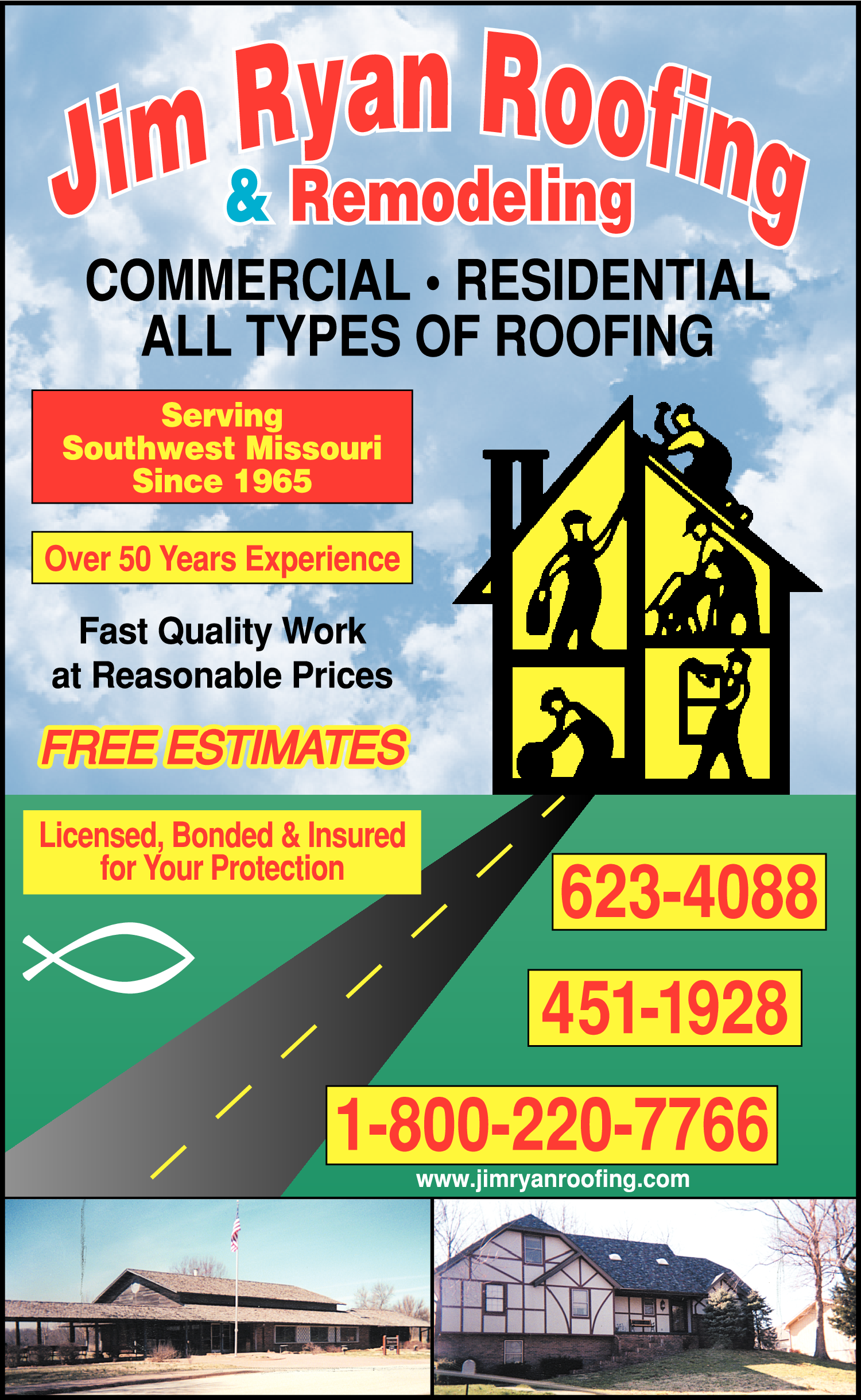 JIM RYAN Roofing & Remodeling is a reputable company based in Neosho, MO, FOR OVER 50 YEARS specializing in a range of roofing and remodeling services. FAMILY 0\/v'NED AND OPERATED, with a team of skilled professionals, the company is dedicated to providing high-quality workmanship and exceptional a.,stomer service to meet the needs of residential and commercial dients. CALL JIM TODAY FOR ALL YOUR ROOFING AND REMODELING. FREE ESTIMATES LICENSED, BONDED & INSURED FOR YOUR PROTECTION.