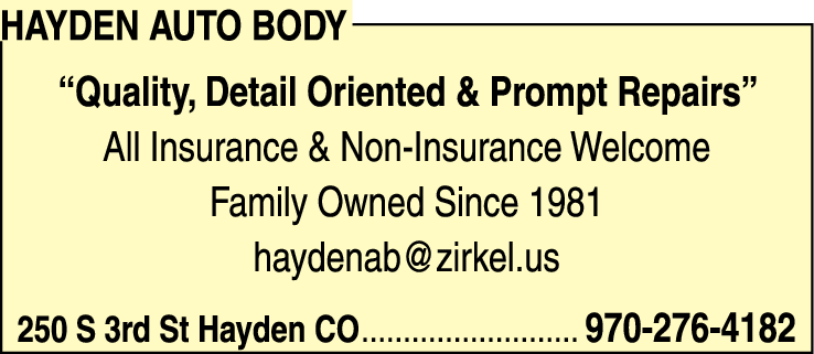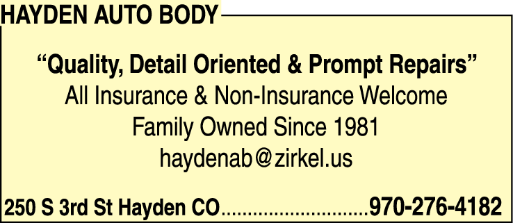 Hayden Auto Body is a family-owned business that has been providing quality, detail-oriented, and prompt auto repairs since 1981. Located at 250 S 3rd St, Hayden, CO, we are dedicated to serving the Hayden community and beyond. Whether your vehicle is covered by insurance or not, our expert team welcomes all types of repair projects. We have built a reputation for delivering exceptional service and exceeding customer expectations. Our commitment to perfection ensures that your repair needs are met with the utmost precision and efficiency. Contact us today at 970-276-4182 or email haydenab@zirkel.us to experience the high-quality craftsmanship and personalized service that sets Hayden Auto Body apart.