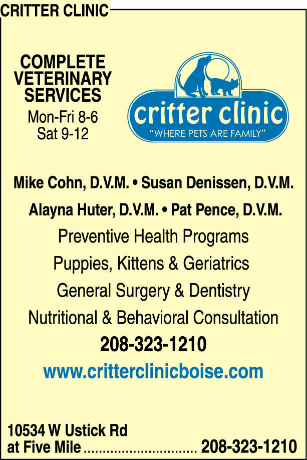 Names and Numbers Verified Pet Grooming VeterinariansCritter Clinic is a dedicated veterinary practice located in Boise, Idaho, committed to providing comprehensive and compassionate care for pets. Our mission is to support the long-term health and well-being of your furry family members through preventative and comprehensive vet…