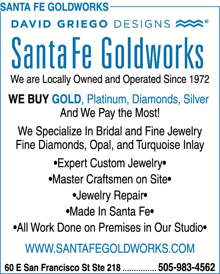 Names and Numbers Verified Gold, Silver & Platinum Buyers Jewelers Jewelers - Repair & Service Jewelry BuyerSanta Fe Goldworks is a locally owned and operated business that has been serving the Santa Fe community since 1972. We are dedicated to providing exceptional service and quality products to our customers. At Santa Fe Goldworks, we specialize in buying gold, platinum, diamon…