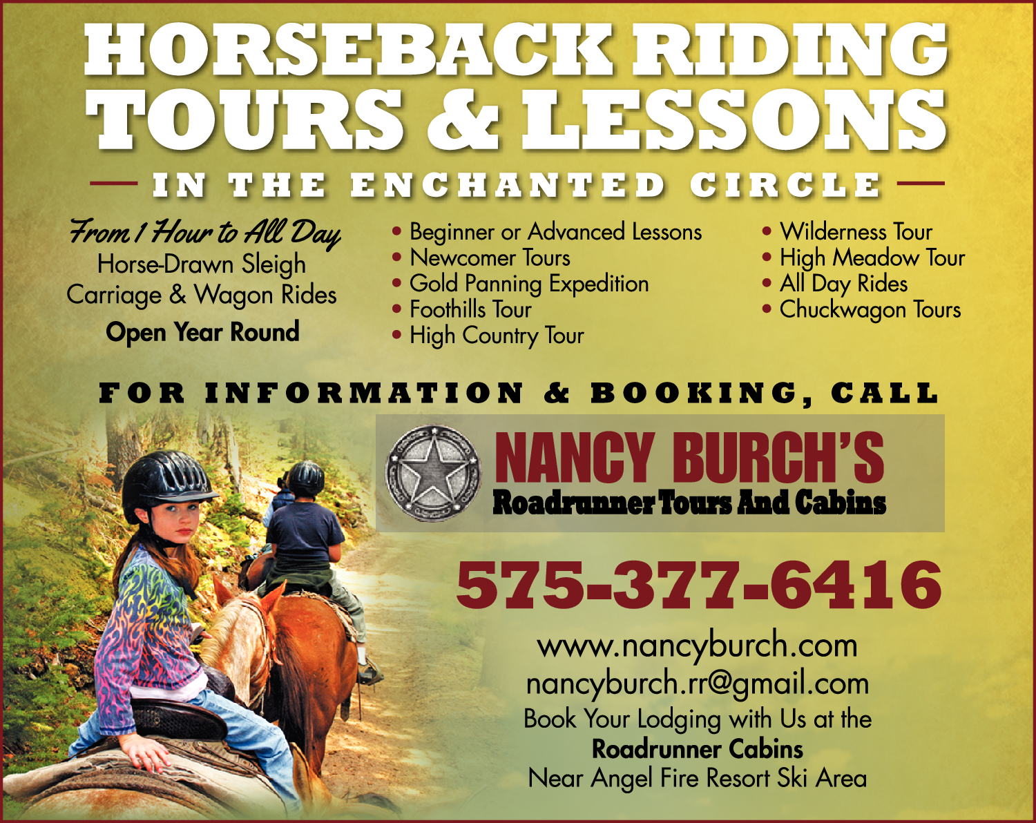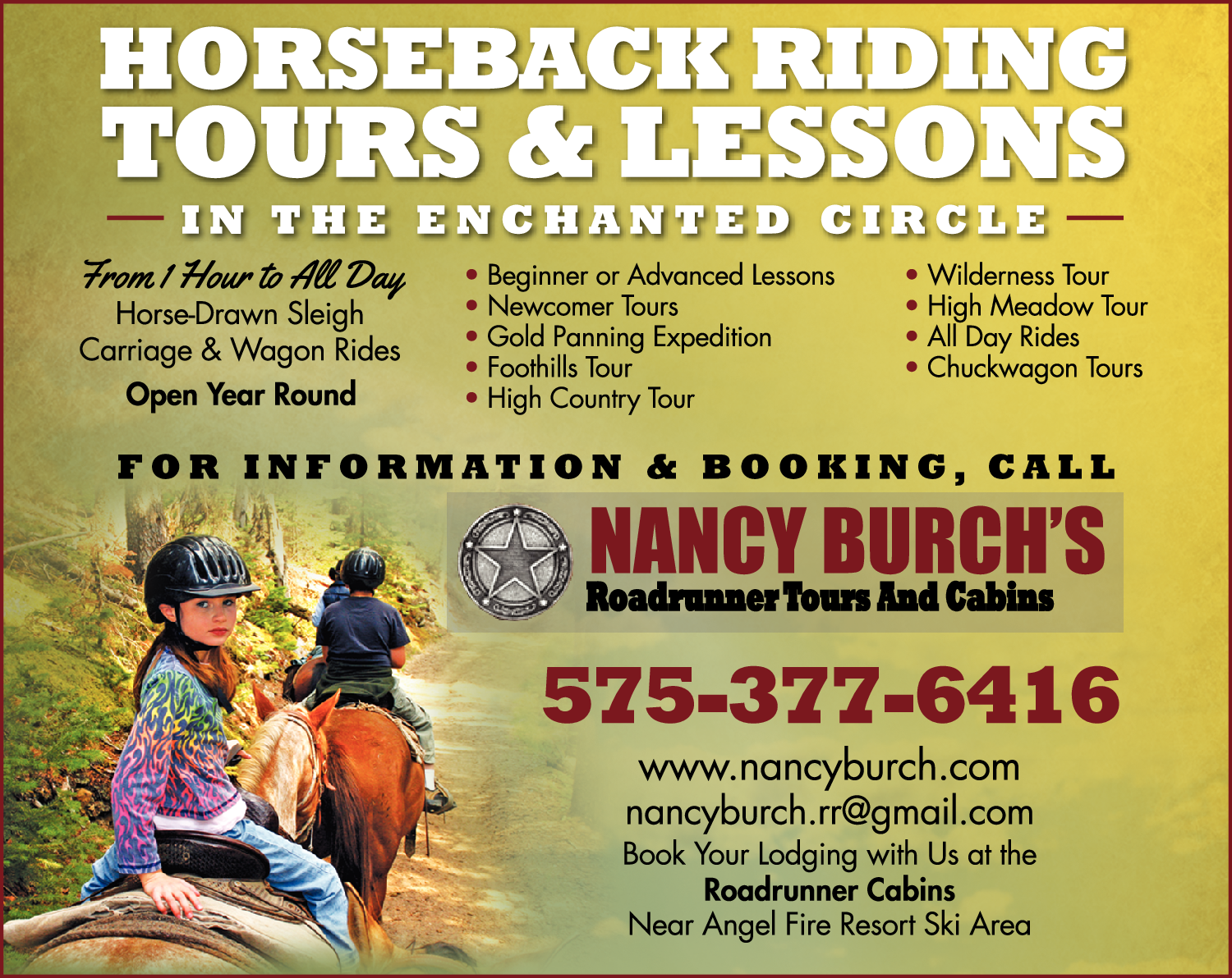 Names and Numbers Verified Cabins Horse Boarding Horse Rentals, Riding & Trail Riding Horse Training & Riding InstructionNancy Burch's Roadrunner Tours And Cabins offers a diverse range of horseback riding experiences and lessons in the Enchanted Circle area. Whether you're a beginner or advanced rider, they have options suited to your skill level. From short 1-hour rides to immersive all-day wild…