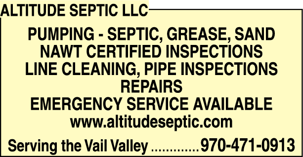 Names and Numbers Verified Septic Tanks - Cleaning, Repair, Service Septic Tanks & Systems - Inspecting & Locating Sewer & Drain Cleaning Service & RepairWith our team of dedicated experts and cutting-edge techniques, we ensure your septic system operates at its best, providing you with a seamless and worry-free experience in Western Colorado.If you' re searching for "septic services near me," look no further. Altitude Septic is …