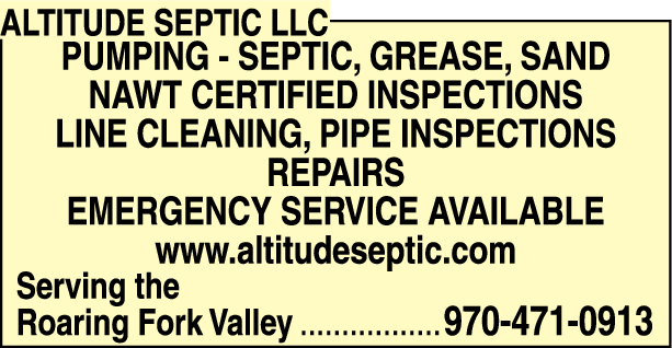 Names and Numbers Verified Grease Traps & Service Plumbing - Drains & Sewer Cleaning Septic Tanks - Cleaning, Repair, ServiceSEPTIC & JETTING SERVICES is a locally owned and accredited business that has been serving the communities of Garfield, Pitkin, and Eagle Counties, including Marble, since 1982. We specialize in septic tank cleaning and inspections, expert sewer and drain cleaning, and electroni…