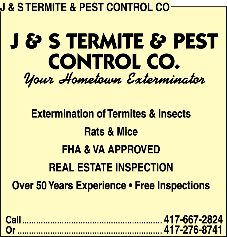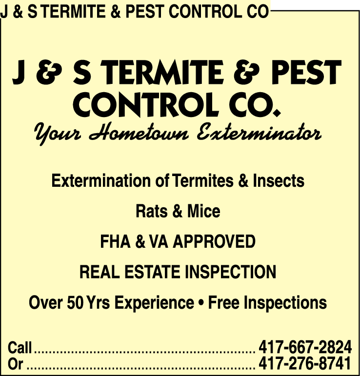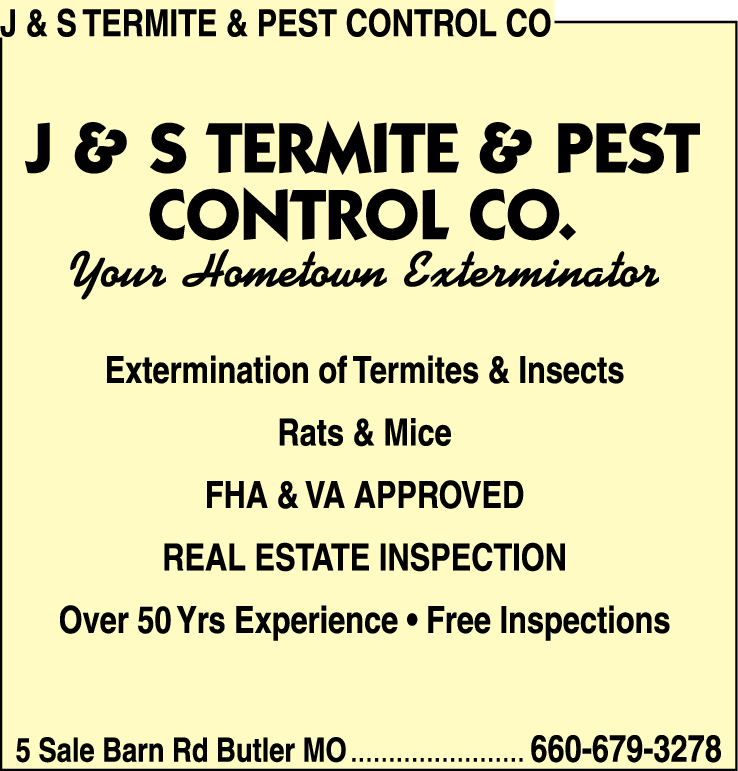 Names and Numbers Verified Pest Control Services Termite Control"J&S Termite & Pest Control Inc, is the best in Bates County/ Butler Missouri for decades running with Pest Control Service. Specializing in stopping Bed Bugs, Tennites, Mice, Cockroaches, Fleas and any other pest that could be in your home or business. J&S Tennite& Pest Control…