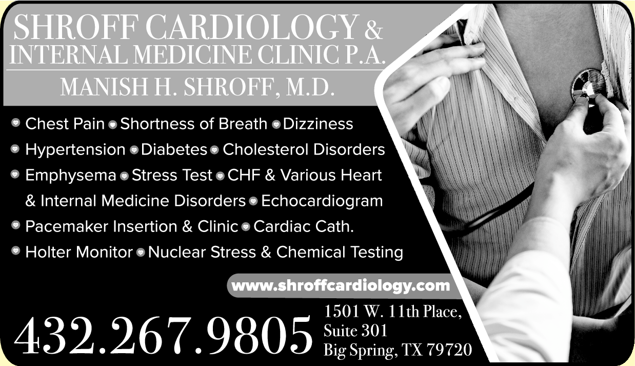 Names and Numbers Verified Cardiology (Heart) Internal Medicine (Diagnosticians)Experienced Cardiologist in Big Spring, TX Shroff Cardiology & Internal Medicine Clinic PA provides experienced care for your heart and your whole body. If you feel sluggish, dizziness or are having trouble breathing, these could be signs of heart or vascular problems. For more…