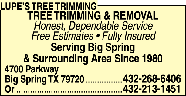 Names and Numbers Verified Tree Service Tree Trimming TREE TRIMMING & PRUNINGLupe's Tree Trimming is a reputable and trusted tree trimming and removal business located in Big Spring, Texas. With over four decades of experience in the industry, we have been proudly serving the residents of Big Spring and the surrounding areas since 1980. At Lupe's Tree…