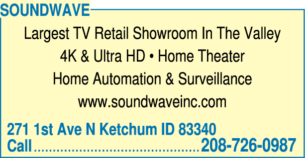 Names and Numbers Verified Television & Radio - Dealers Home Automation Stereo & Hi-Fi Equipment - Dealers Home TheatresSoundwave is the premier custom A/V company in the Wood River Valley. We have been serving the community since 1996, providing home entertainment solutions for every budget. From high end, fully integrated home theatre systems to portable DVD players and headphones, Soundwave ha…