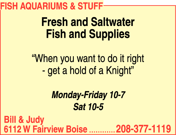 Names and Numbers Verified Aquariums & Aquarium Supplies & Maintenance Pet ShopsFish Aquariums and Stuff is Idaho's premier aquarium store, founded in 2001 by Bill and Judy Knight. Located in Boise, we are the largest specialized aquarium retailer in the state, offering comprehensive solutions for freshwater, saltwater, and coral aquarium enthusiasts. Our …
