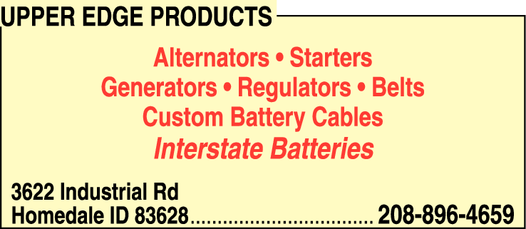 Names and Numbers Verified Alternators, Generators & Starters - Automotive Repairing Batteries - RetailUpper Edge Products is locally owned and operated in Homedale, Idaho. Sales and Services for alternators and starters. Call us Today!