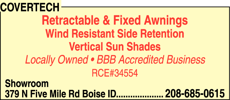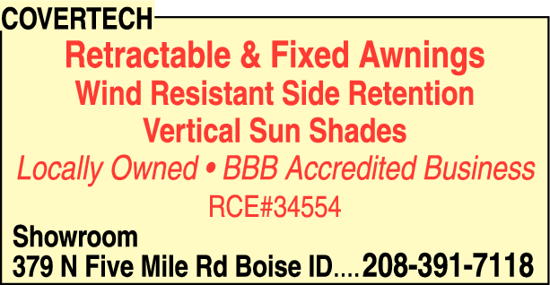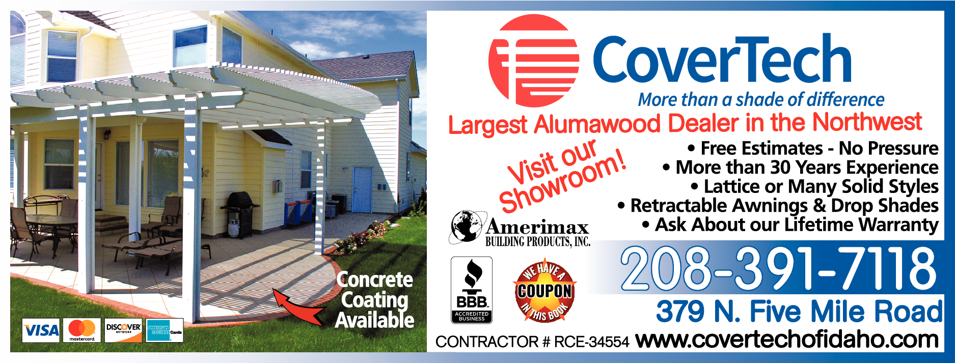 Names and Numbers Verified Awnings Canopies Concrete - Decorative Patio, Deck & Porch Builders & Enclosures Screens - Door & WindowCoverTech provides quality work at a fair price from a team of experienced designers, installers, sales associates and administrative staff. Trusted in the Treasure Valley for nearly 20 years, we help you beautify your outdoor living spaces with patio covers, shades, awnings,…