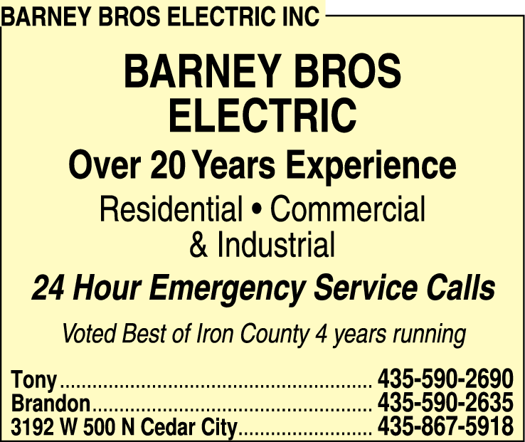 Names and Numbers Verified Electrician Generators RemodelingBarney Bros Electric provides commercial, residential, and industrial electrical service and backup generator installation to Cedar City, UT, and the surrounding areas