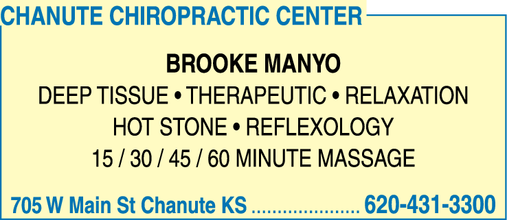 Massage Therapists in this list provide services to multiple zip codes in and around Chanute (i.e 66720). For specific service areas, kindly reach out to the individual businesses.