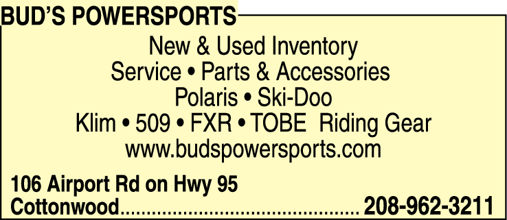 Names and Numbers Verified All-Terrain Vehicles (ATVs) All-Terrain Vehicles (ATVs) - Parts & Accessories All-Terrain Vehicles (ATVs) - Repairing Boat DealersBud’s Powersports in Cottonwood, Idaho, is a long-established and growing powersports dealer for the surrounding area. We serve the northern Idaho communities of Cottonwood, Grangeville, White Bird, Riggins, Craigmont, Kamiah, Orofino, Nez Perce and Lewiston … to name just a few…
