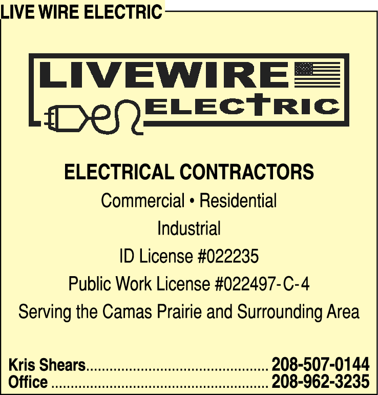 Names and Numbers Verified ElectricianLivewire Electric, owned by Kris Shears, is located in Cottonwood. Since 2007, Livewire Electric has offered residential, commercial and industrial electrical contracting and repair along with full pump service and solar power systems. Serving the Camas Prairie, Clearwater Valle…