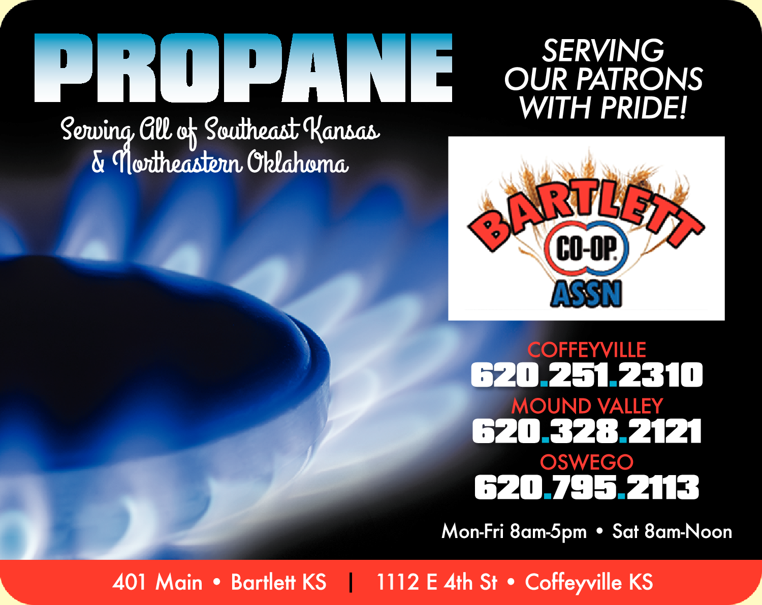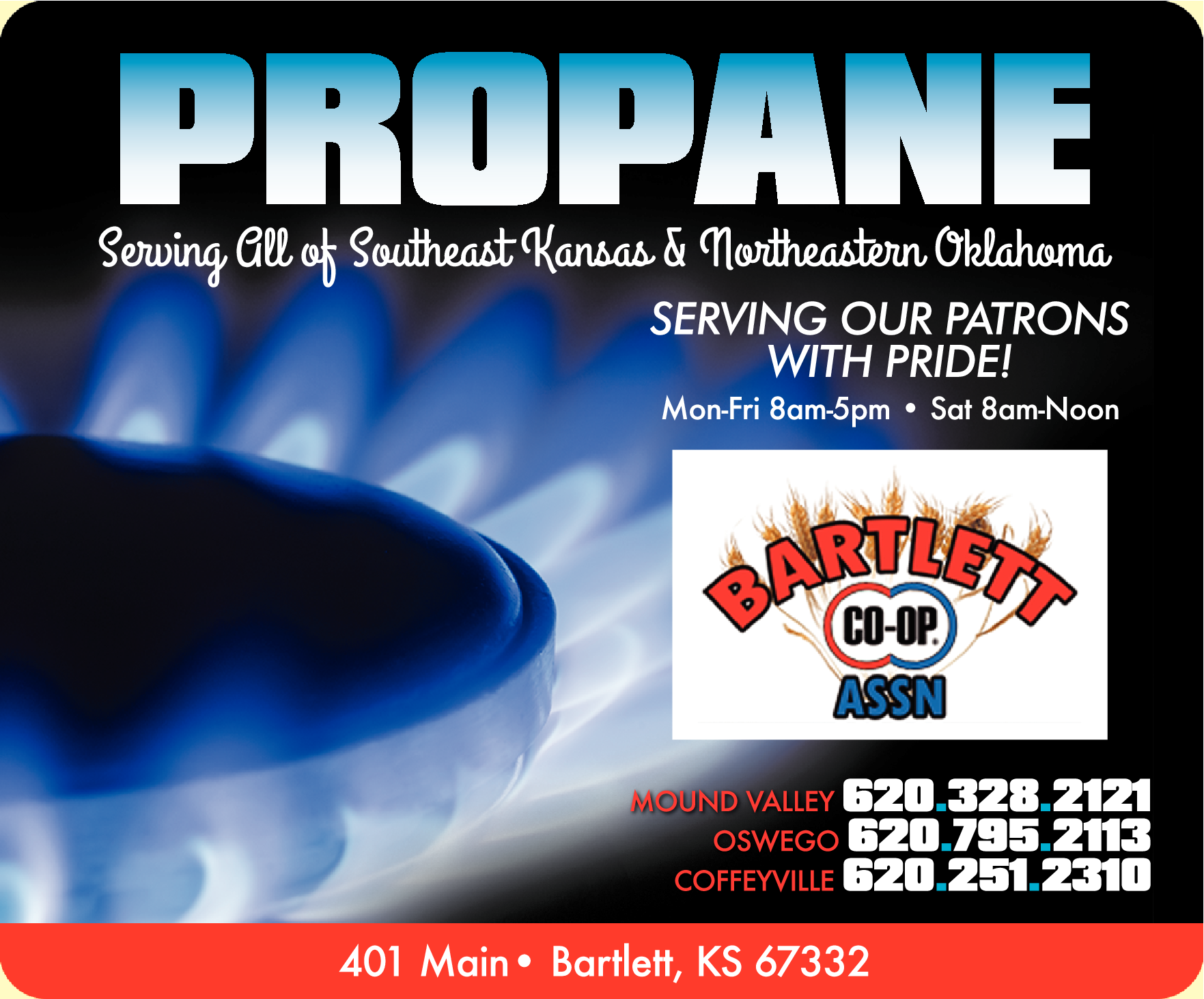 Names and Numbers Verified Chemicals - Agriculture Farm Supplies & Services Feed Dealers Propane GasThe Bartlett Co-op Association is a patron owned agriculture cooperative with locations in Southeast Kansas and in NE Oklahoma. We sell a wide variety of products including feed, fertilizer, chemicals, fuel, and other agricultural products. Be sure to check out our Monthly Deals!