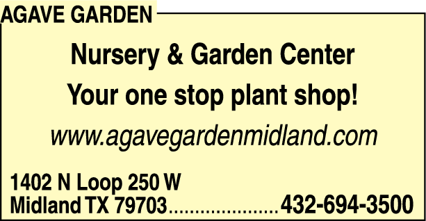 Names and Numbers Verified Landscapers Nurseries - Plants, Trees, Etc GardensAgave Garden is a locally owned and family operated full service garden center, offering the highest quality nursery and landscape materials in Midland, TX. We are dedicated to the success of our do-it-yourself landscape customers, gardeners and hobbyists and strive to help our …