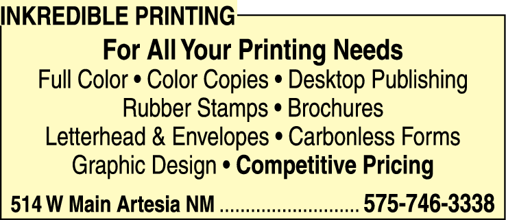 Names and Numbers Verified PrintersINKREDIBLE PRINTING is a professional printing business located in Artesia, NM. We offer a wide range of printing services to cater to all your printing needs. With our state-of-the-art equipment and skilled team, we ensure high-quality output every time. Our services include…