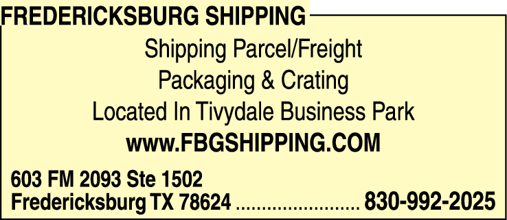 Names and Numbers Verified Packing & Crating Service Shipping & Packaging Service Shipping & PackingFredericksburg Shipping is a professional shipping and logistics company located in Tivydale Business Park, Fredericksburg, Texas. We specialize in shipping parcel and freight, offering packaging and crating services to ensure the safe transportation of your goods. Our team is e…