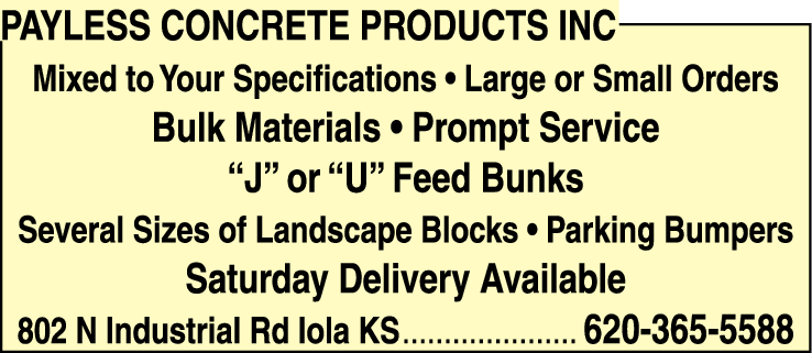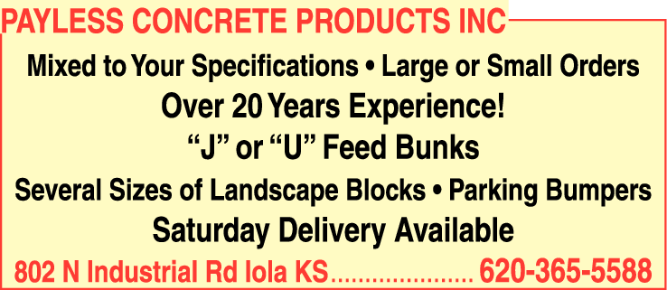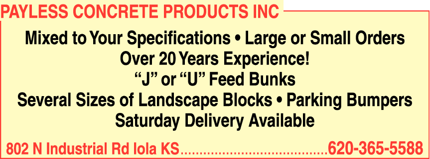 Names and Numbers Verified Concrete - Ready Mixed Concrete Breaking, Cutting, Sawing, Etc Contractors - Concrete Farm EquipmentPayless Concrete Products Inc in Iola, KS offers a range of concrete products for various construction needs. Your concrete ready mix company to rely on customer satisfaction through serving our customers and community for over 30 years. We also provide Concrete Feed Bunks for t…