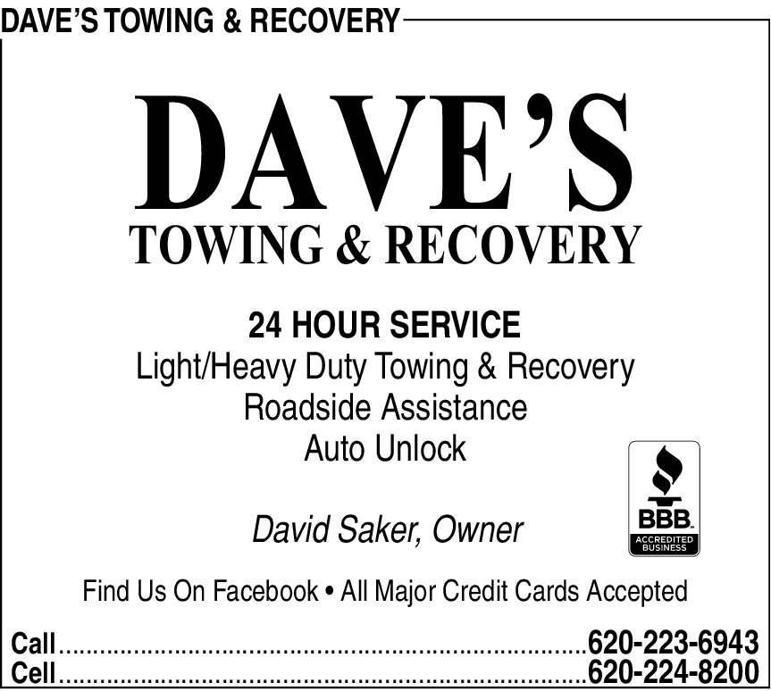 Names and Numbers Verified Automobile Towing Automotive Towing Lockout Service LocksmithsDave's Towing & Recovery in Fort Scott, KS, located at 2499 Locust Rd, offers vehicle towing (including semis, accidents, disabled vehicles), roadside assistance, auto wrecking, demolition services, and roll-off containers, holding an A+ BBB rating for comprehensive heavy-duty a…