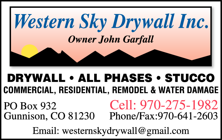 Names and Numbers Verified Drywall ContractorsWestern Sky Drywall in Gunnison is a local business located in Gunnison, specializing in all phases of drywall services including stucco and water damage repair for residential and commercial projects. We are known for our excellent, quality work. Please give us a call for more…