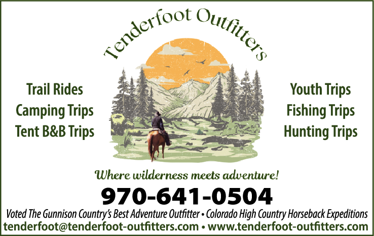 Names and Numbers Verified Horse Rentals, Riding & Trail Riding Outfitters & GuidesTenderfoot Outfitters: Your Gateway to Authentic Colorado Wilderness Adventures; ; Located in the heart of the Gunnison National Forest, Tenderfoot Outfitters offers unparalleled horseback riding and outdoor experiences in Colorado's breathtaking West Elk Wilderness. Specializi…