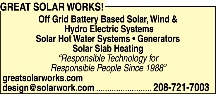Names and Numbers Verified Solar Energy Contractors Solar Energy Equipment & SystemsGreat Solar Works! Responsible technology for responsible people! Design, installation and repair of solar electrical systems, grid-tied & off-grid battery based remote systems. We offer hydro and wind electrical systems, both grid-tied and off-grid battery based for remote ho…
