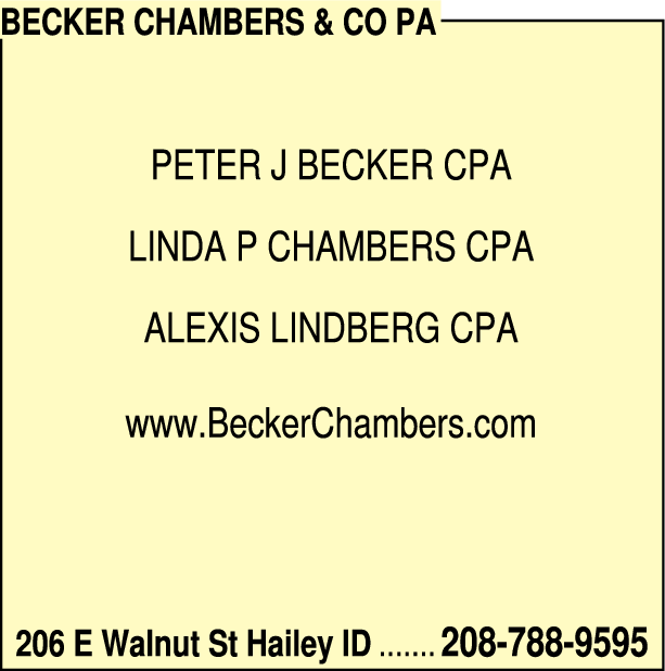 Names and Numbers Verified Certified Public Accountants Tax Return PreparationBecker, Chambers & Co., P.A. is a full-service accounting firm licensed in Idaho. We offer a broad range of services for business owners, individuals, and not-for-profit organizations. We provide outstanding service to our clients because of our dedication to professionalism, re…