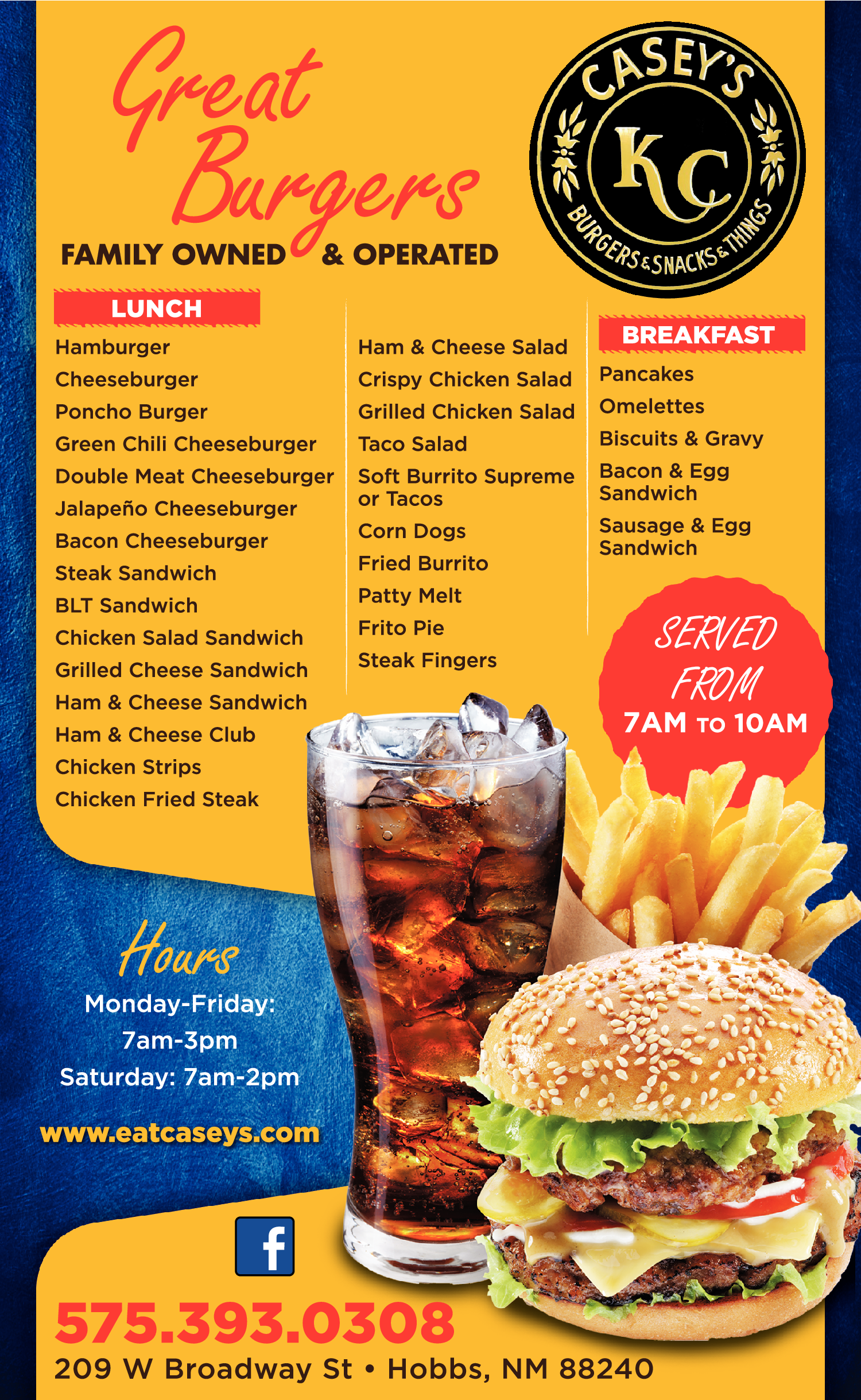 Names and Numbers Verified RestaurantsLocated in the Downtown Mini-Mall, Casey's offers burgers, snacks, and desserts every day! Specials: Tuesday- Taquito Tuesday