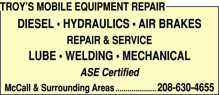 Names and Numbers Verified Heavy Equipment - Repair Tractor Repair & Service Truck Repair & Service Hydraulic Equipment RepairTroy's Mobile Equipment Repair is a trusted and professional mobile repair and service company specializing in diesel, hydraulics, and air brakes. With our ASE certification, we guarantee top-notch quality and expertise in all our services. Operating in the McCall and surroundin…