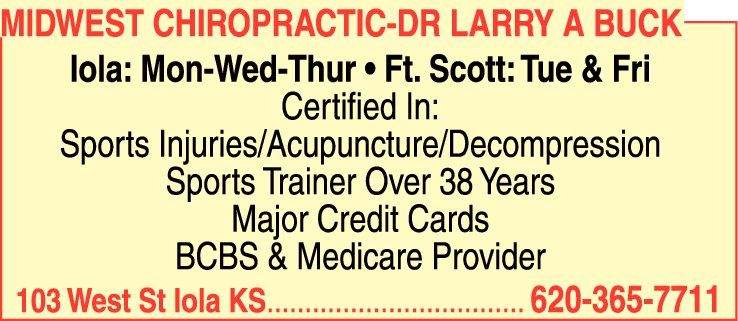 Names and Numbers Verified Acupuncture, Acupressure & Meridian Therapy Chiropractors - DC Vitamins & Food SupplementsMidwest Chiropractic, located in Iola, KS is led by Dr. Larry Buck, a dedicated chiropractor committed to enhancing the health and well-being of his patients. They provide a range of chiropractic services designed to alleviate pain, improve mobility, and promote overall wellne…