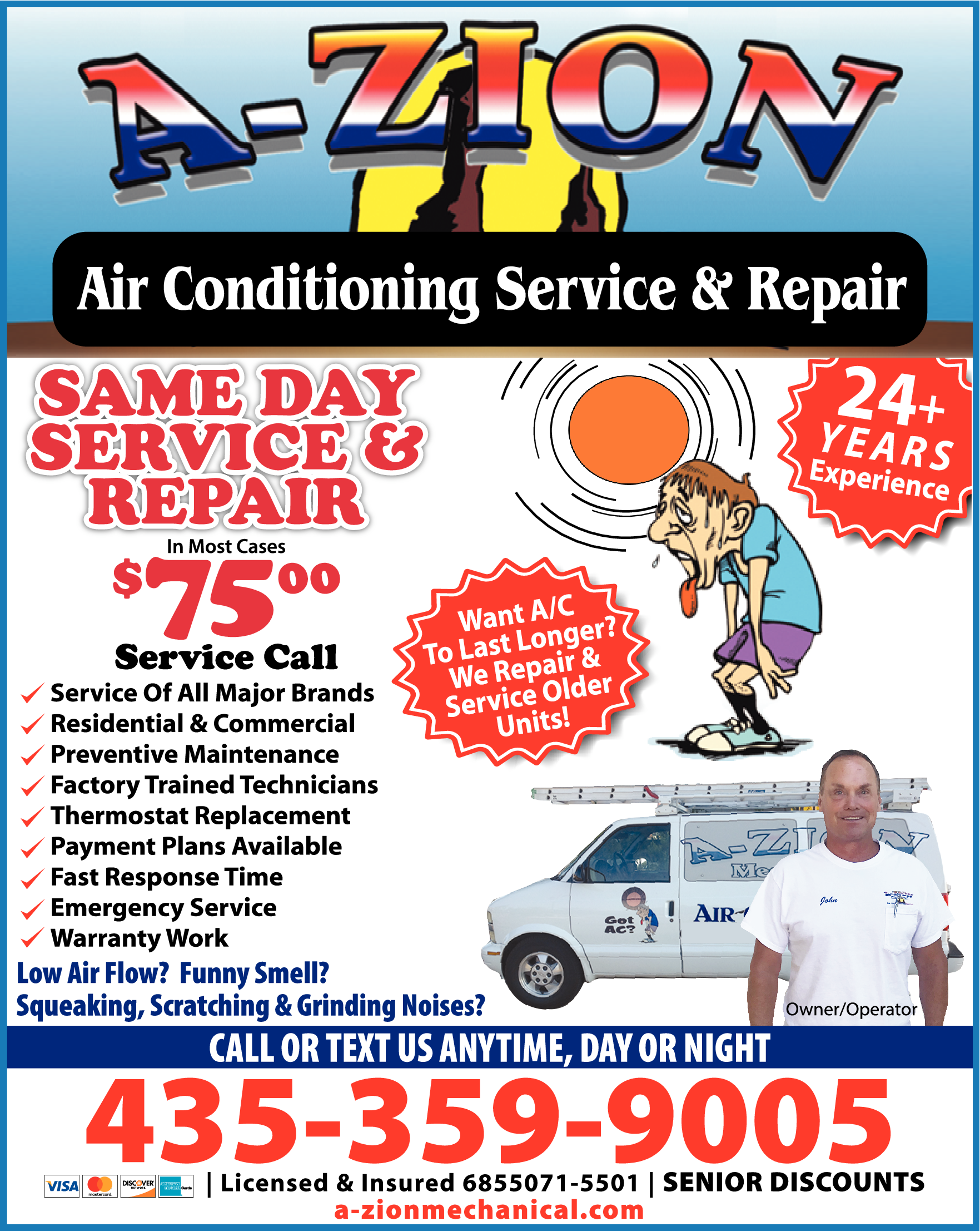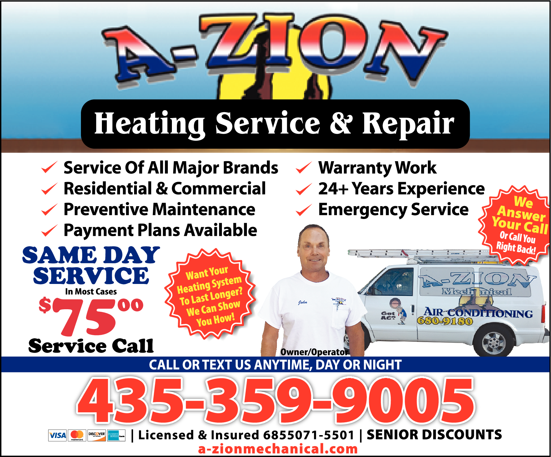 Names and Numbers Verified Air Balancing Air Conditioning Contractors Air Purification & Filtration Equipment Controls, Control Systems & RegulatorsA-Zion Mechanical is a heating service and repair business that offers same-day service for all major brands of heating systems. We specialize in providing high-quality residential and commercial services, including preventive maintenance and warranty work. With over 23 years of…