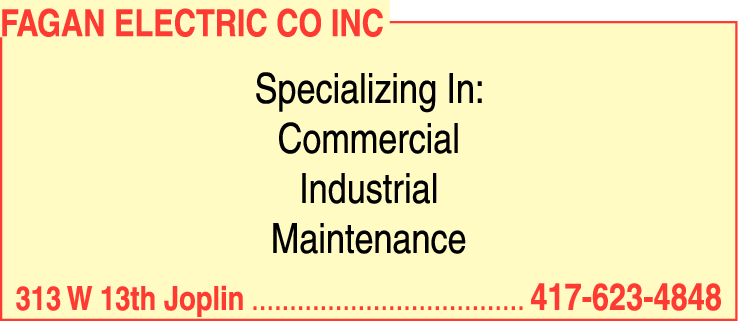 Names and Numbers Verified Electrician Electric Contractors - Industrial & CommercialFagan Electric Inc in Joplin, MO, is a top-tier electrician offering reliable services to residential and commercial dients. With a team of skilled professionals, they specialize in electrical installations, repairs, and maintenance, ensuring safe and efficient solutions for all…