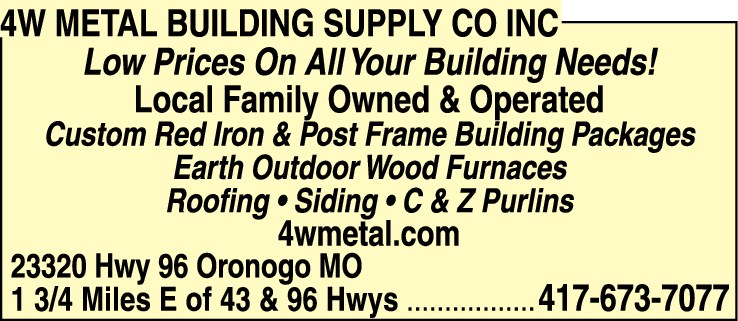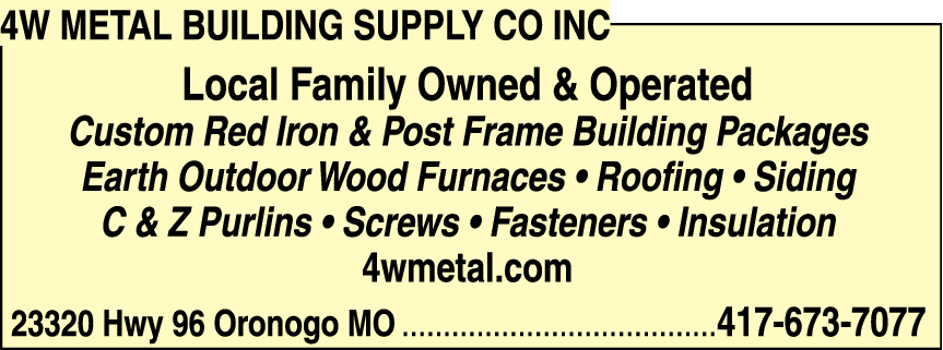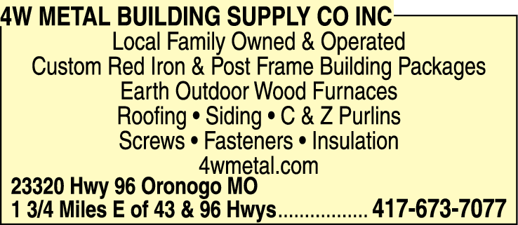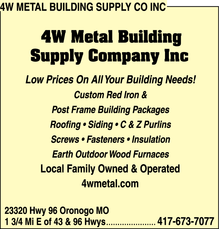 Names and Numbers Verified Metal Buildings Building Materials Roofing Materials Insulation Materials - Cold & Heat4W METAL BUILDING SUPPLY INC is a local, family-owned and operated business located in Oronogo, Missouri. From gutters to downspouts, we have got you covered. We're your best bet in all of Joplin, MO and the surrounding areas for all your metal product needs. Call or visit us no…